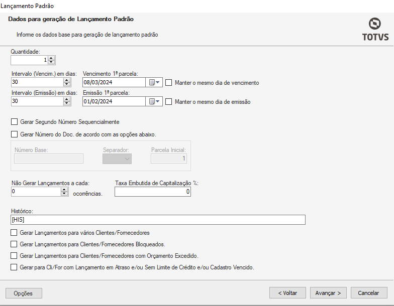 Lançamento padrão | Aba- Dados para geração de lançamento padrão