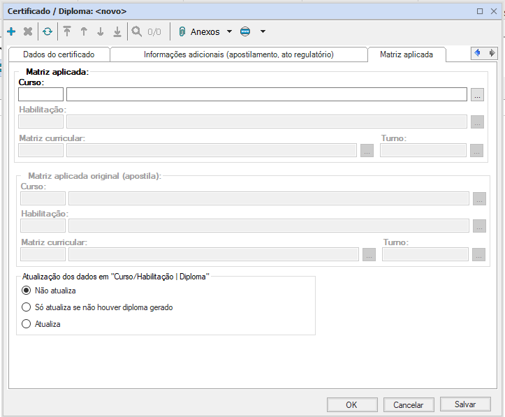 A aba “Matriz Aplicada” não deverá ser preenchida nos casos de certificação dos tipos “Competência” e “Atv. Ofertada”
