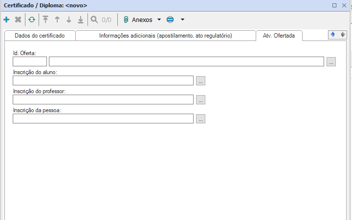 Observação: Nos casos de certificação do tipo “Atv. Ofertada” será habilitada uma aba onde deverá ser preenchido os campos, Id. oferta e a inscrição podendo ser do aluno, professor ou da pessoa