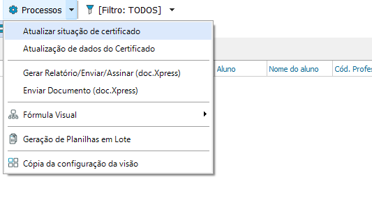 Para realizar o processo de atualização da situação do certificado, selecione o certificado e “Processos- Atualizar situação de certificado”