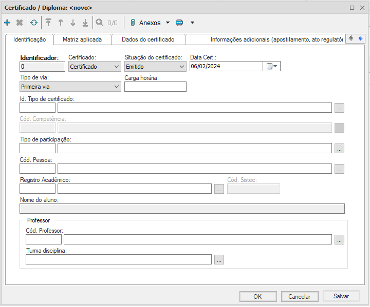 Cód. Competência: campo habilitado somente quando o tipo de certificado for “Competência”;