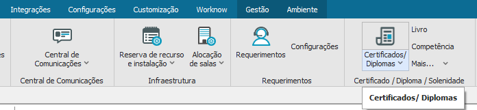 O processo que será apresentado abaixo está localizado no “Módulo Educacional” aba “Atividades Acadêmicas” opção “Certificados/ Diplomas”