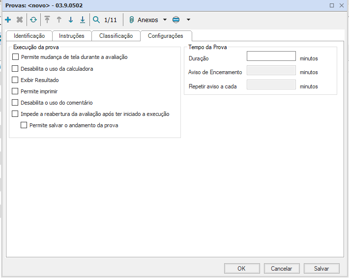 Aba onde pode ser configurado alguns itens da prova que está sendo criada