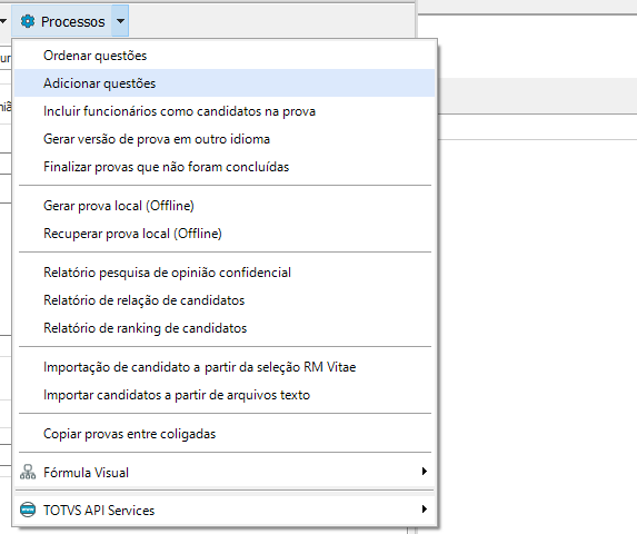 Para realizar a vinculação das questões na avaliação correspondente, selecione a prova desejada e em seguida, escolha a opção “Processos- Adicionar Questões”