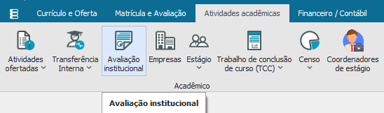 Para realizar o processo de avaliação institucional é necessário escolher a opção “Avaliação Institucional” dentro da aba “Atividades Acadêmicas”
