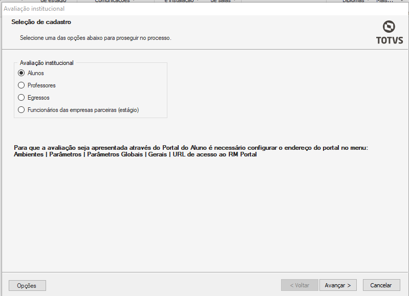 Após selecionar a opção acima, selecione qual o público que irá responder a avaliação e em seguida, clique em “avançar”