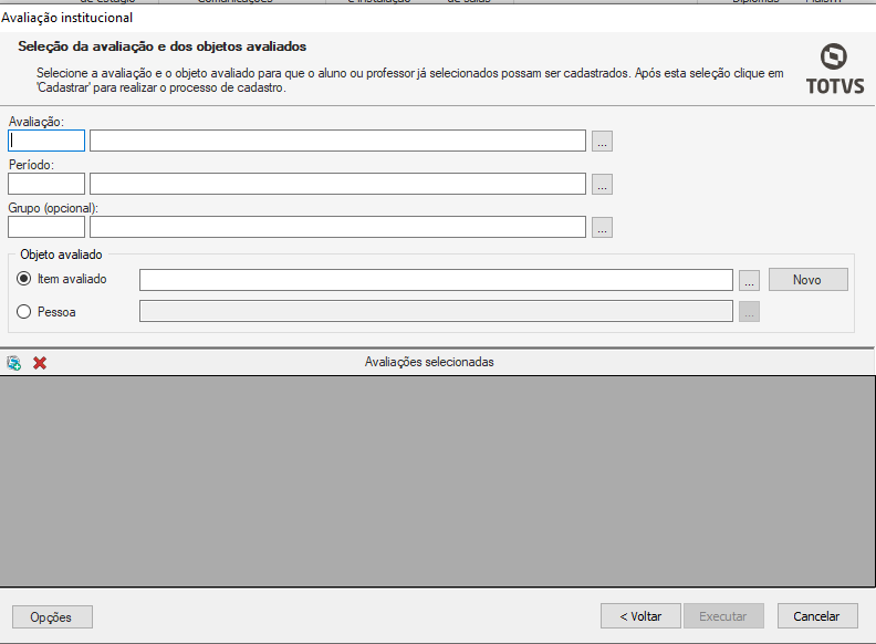 Objeto avaliado: selecione o item ou a pessoa que será avaliado;