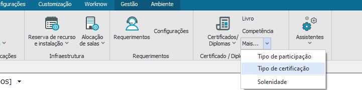 O cadastro que será apresentado a seguir está localizado no “Módulo Educacional- Educacional” aba “Atividades Acadêmicas” opção “Mais- Tipos de Certificação”