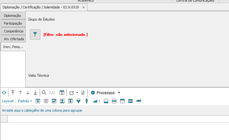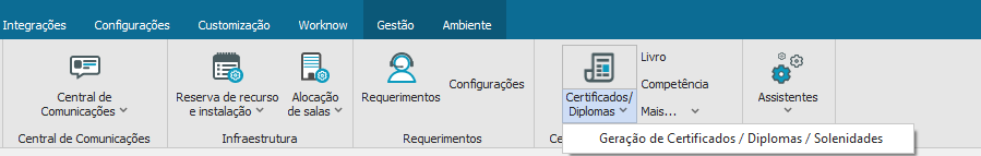 O processo de emissão dos certificados/ diplomas acontecem no “Módulo Educacional- Educacional” aba “Atividades Acadêmicas” opção “Certificados/ Diplomas- Geração de Certificados/ Diplomas/ Solenidades”