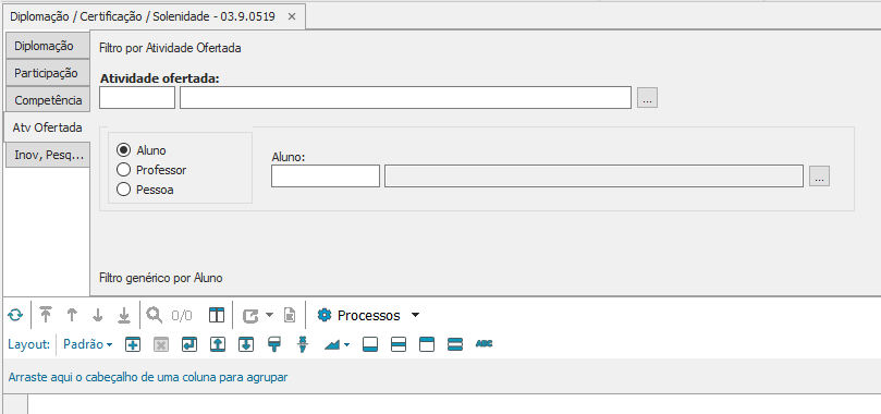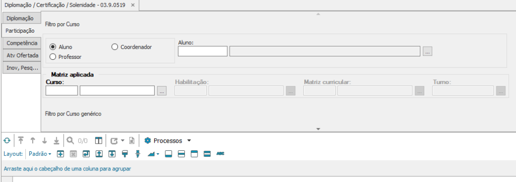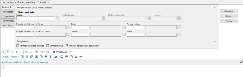 Na geração de diploma é necessário preencher alguns campos, sendo eles curso, situação de matrícula no curso, polo, turma, período letivo e aluno, depois de preencher existe a possibilidade de criação de um filtro para buscar um determinado grupo de aluno, de acordo com a necessidade