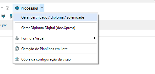 Depois de realizar o preenchimento da aba correspondente é necessário escolher a opção “Processos- Gerar Certificado/ Diploma/ Solenidade”