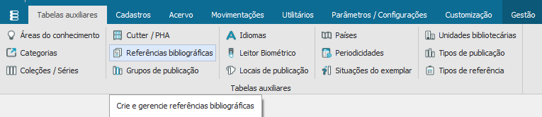 O cadastro que será apresentado abaixo está localizado no “Módulo Educacional- Gestão Bibliotecária” aba “Tabelas Auxiliares” opção “Referências Bibliográficas”