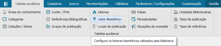 O cadastro de leitores biométricos está localizado no “Módulo Educacional- Gestão Bibliotecária” aba “Tabelas Auxiliares”