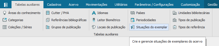 O cadastro de situações do exemplar está localizado no “Módulo Educacional- Gestão Bibliotecária” aba “Tabelas Auxiliares”