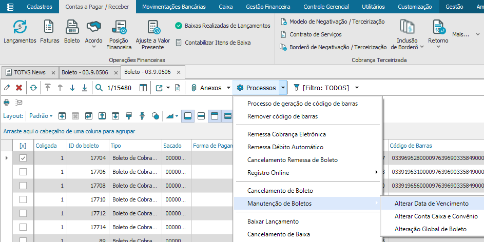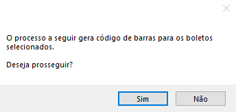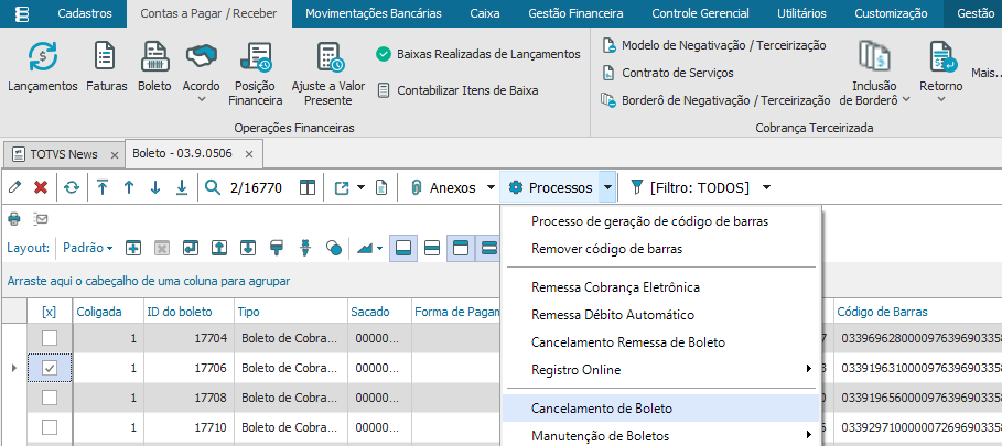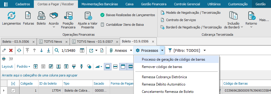 Para gerar o código de barras de boleto, selecione o boleto desejado e escolha a opção “Processos- Processo de Geração de Código de Barras”