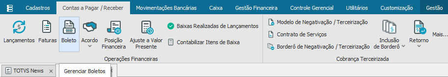 O processo a seguir está localizado no módulo “BackOffice- Gestão Financeira” aba “Contas a Pagar/ Receber” opção “Boleto”