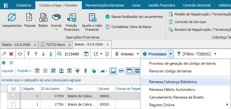 Para realizar o envio das remessas, selecione um ou mais boletos e escolha a opção “Processos- Remessa Cobrança Eletrônica”