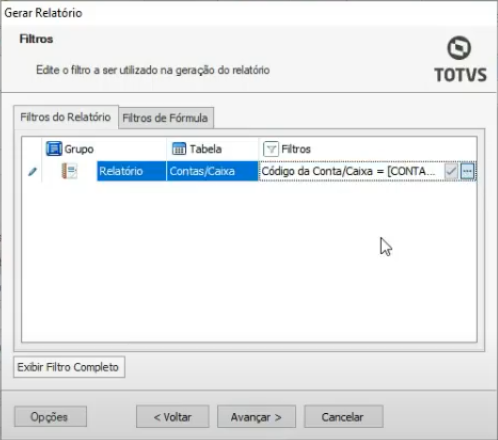 Nesta aba se é possível informar a Conta / Caixa e editar o filtros a serem usados na geração deste relatório, prossiga clicando em “Avançar”