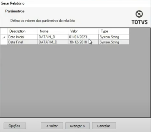 Defina os parâmetro de data inicial e final que serão emitidos um relatório