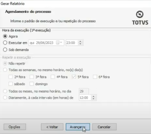 – Agora: Sendo selecionado este a execução acontecerá assim que você finalizar esse processo.
