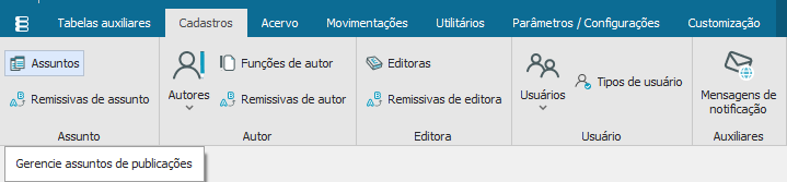 O cadastro de assuntos está localizado no “Módulo Educacional- Gestão Bibliotecária” aba “Cadastros” opção “Assuntos”