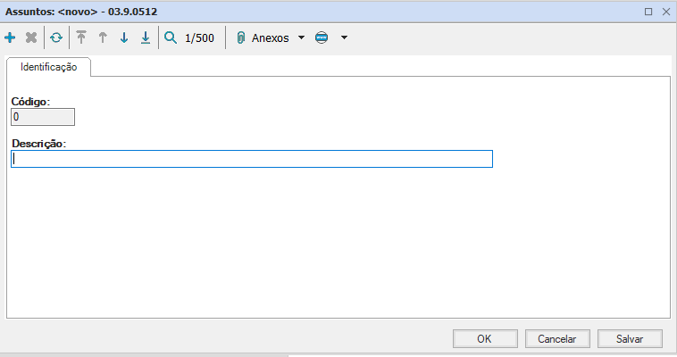 Para realizar o cadastro de um assunto, após escolher a opção acima, clique em “incluir” e preencha o campo descrição com o nome do assunto que está sendo cadastrado