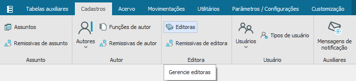 O cadastro das editoras está localizado no “Módulo Educacional- Gestão Bibliotecária” aba “Cadastros” opção “Editoras”