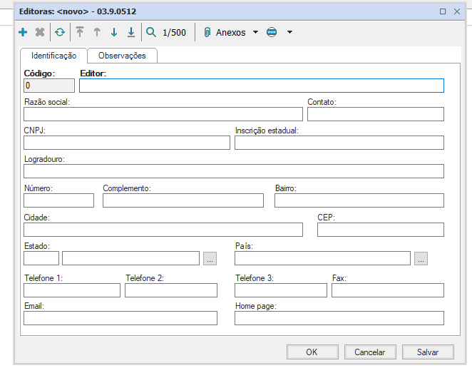 Para realizar o cadastro das Editoras, depois de escolher a opção acima clique em “incluir” e preencha as informações do cadastro, preenchendo os campos obrigatórios e opcionais