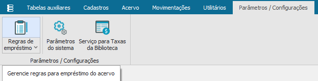 O cadastro de Regras de Empréstimo está localizado no “Módulo Educacional- Gestão Bibliotecária” aba “Parâmetros/ Configurações” opção “Regras de Empréstimo”