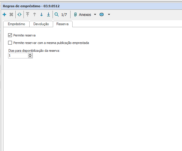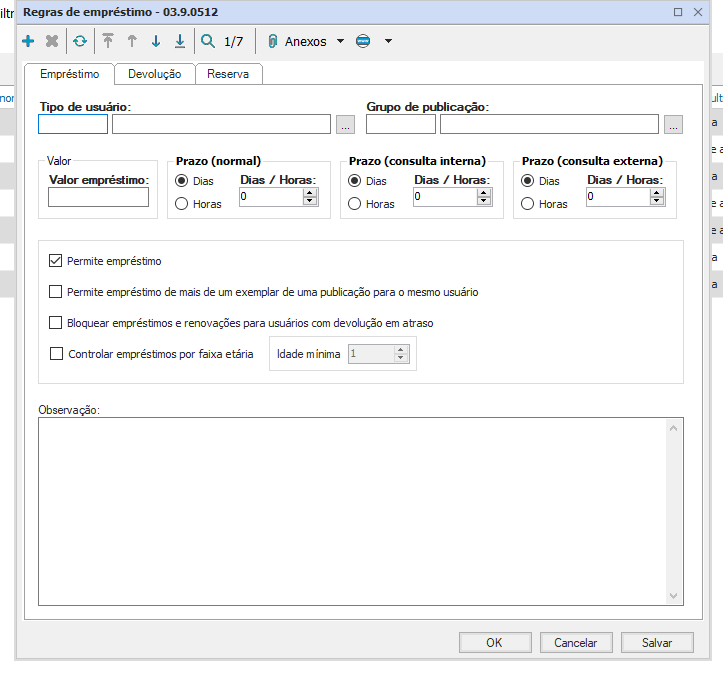Na aba empréstimo deve ser informado sobre o tipo de usuário, grupo de publicação e prazos, pode ser acrescentado também algumas observações referentes a regra que está sendo cadastrada