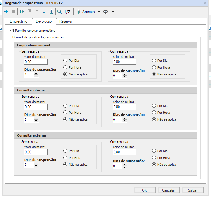 A aba devolução deve ser preenchida com as informações referentes as penalidades por devolução em atraso de acordo com a política vigente da instituição