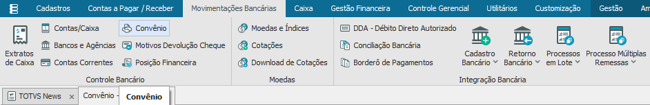 O cadastro a seguir está localizado no “Módulo BackOffice- Gestão Financeira” aba “Movimentações Bancárias” opção “Convênio”