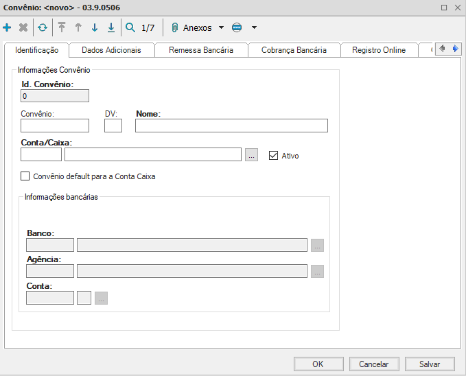 Para criar um novo convênio para uma Conta/ Caixa específica, preencha as informações de acordo com as instruções abaixo