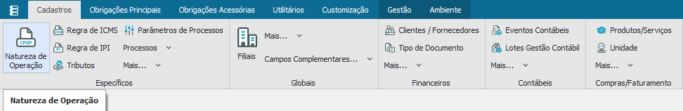 O cadastro da Natureza de Operação está localizado no “Módulo BackOffice- Gestão Fiscal” aba “Cadastros”