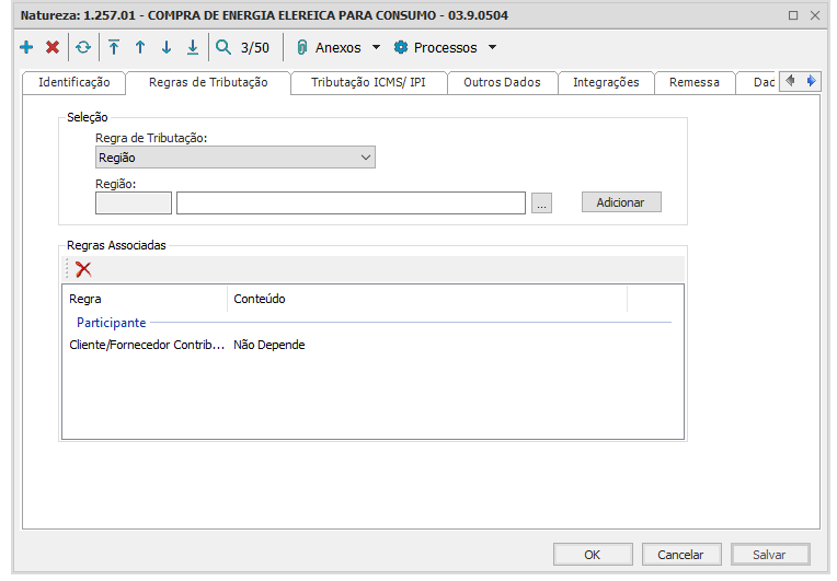 - Regra de Tributação: selecione a regra de acordo com a natureza que está sendo cadastrada;