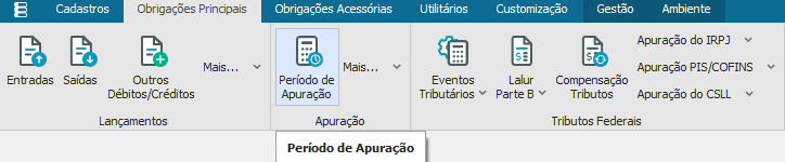 O cadastro do Período de Apuração, está localizado no “Módulo BackOffice- Gestão Fiscal” aba “Obrigações Principais”