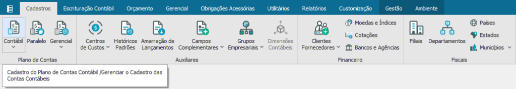 O cadastro do Plano de Contas está localizado no “Módulo BackOffice- Gestão Contábil” aba “Cadastros”