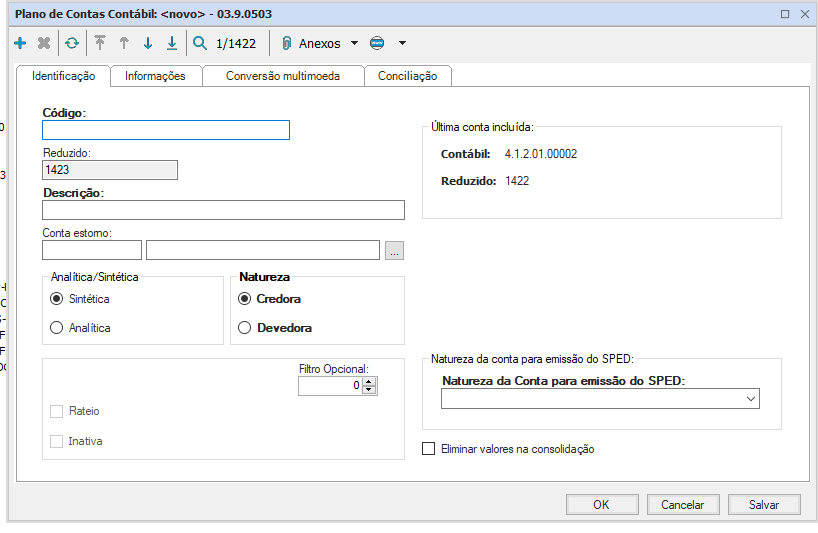 Descrição: informe o nome do plano de contas que está sendo criado;