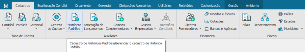 O Cadastro dos Históricos Padrões está localizado no “Módulo BackOffice- Gestão Contábil” aba “Cadastros”