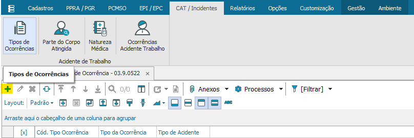 Para efetuar o cadastro de Tipos de Ocorrências acesse a aba “CAT/ Incidentes” opção “Tipos de ocorrências” e clique em “Incluir”